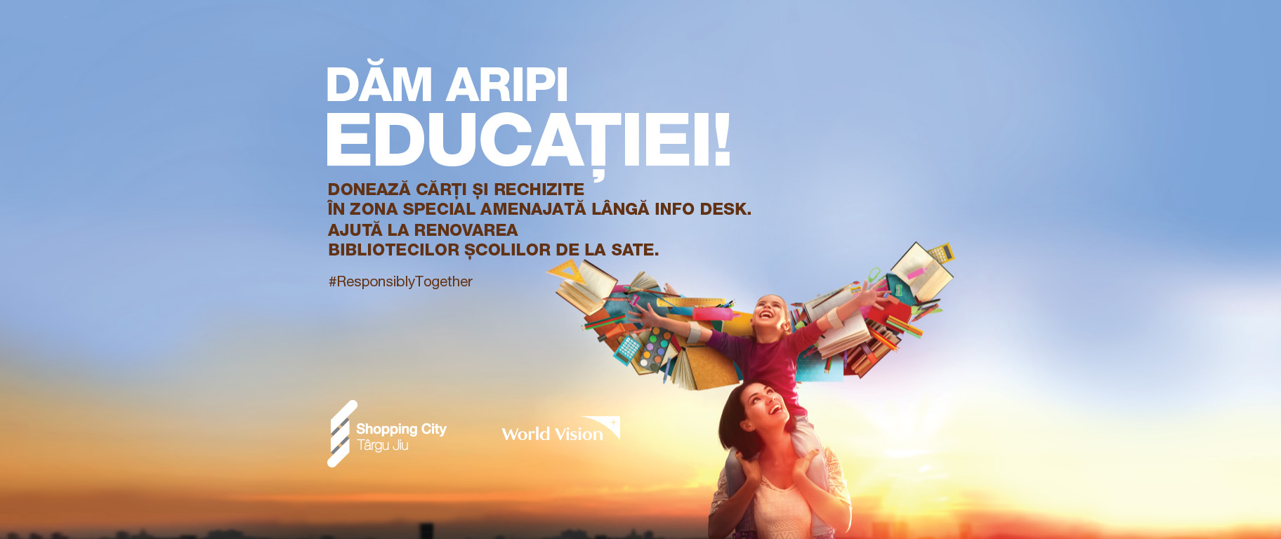 ”Alături de World Vision România, te invităm și anul acesta să fii partenerul nostru de fapte bune și, împreună, să îi ajutăm pe tinerii din comunitățile defavorizate să învețe să își spună povestea. Fii alături de noi si donează cărți noi/ în stare bună sau rechizite noi, în perioada 13 septembrie – 6 octombrie, în spațiul amenajat în Shopping City Târgu Jiu, la parter, lângă Info Desk. Împreună dăm aripi educației!”, au transmis reprezentanții mall-ului din Târgu-Jiu.