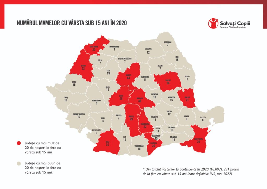 „Cu toate că România a dat sub 5% din numărul total de naşteri din Uniunea Europeană în 2020, 44,44% dintre fetele care au născut înainte de a împlini 15 ani sunt din România, care ocupă, astfel, primul loc în Uniunea Europeană la acest capitol, potrivit datelor definitive Eurostat. În cifre absolute, dintre cele 1.645 de fete cu vârsta între 10 şi 15 ani, devenite mame în 2020 în statele membre, 731 sunt românce. În total, aproape 30% din mamele minore (sub 18 ani) din UE provin din ţara noastră (8.276 din 29.505, la nivelul întregii Uniuni Europene)”, a comunicat Organizaţia Salvaţi Copiii România.