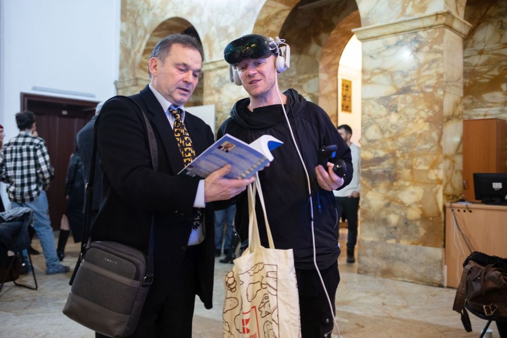 Domnul Florin Marc a prezentat un experiment de realitate virtuală, numit „Dialog cu Brâncuși”, care a dat publicului prezent posibilitatea de a „comunica”, prin intermediul tehnologiei de inteligență artificială, cu marele sculptor. Mai exact, el a propus două instalații, una de realitate virtuală și o alta în fața unui ecran, pentru a încerca să creeze un dialog cu un avatar, realizare care are în spate mai multe tehnologii, printre care și AI. I se puteau pune astfel întrebări avatarului Brâncuși, care răspundea în limita informațiilor introduse în program.