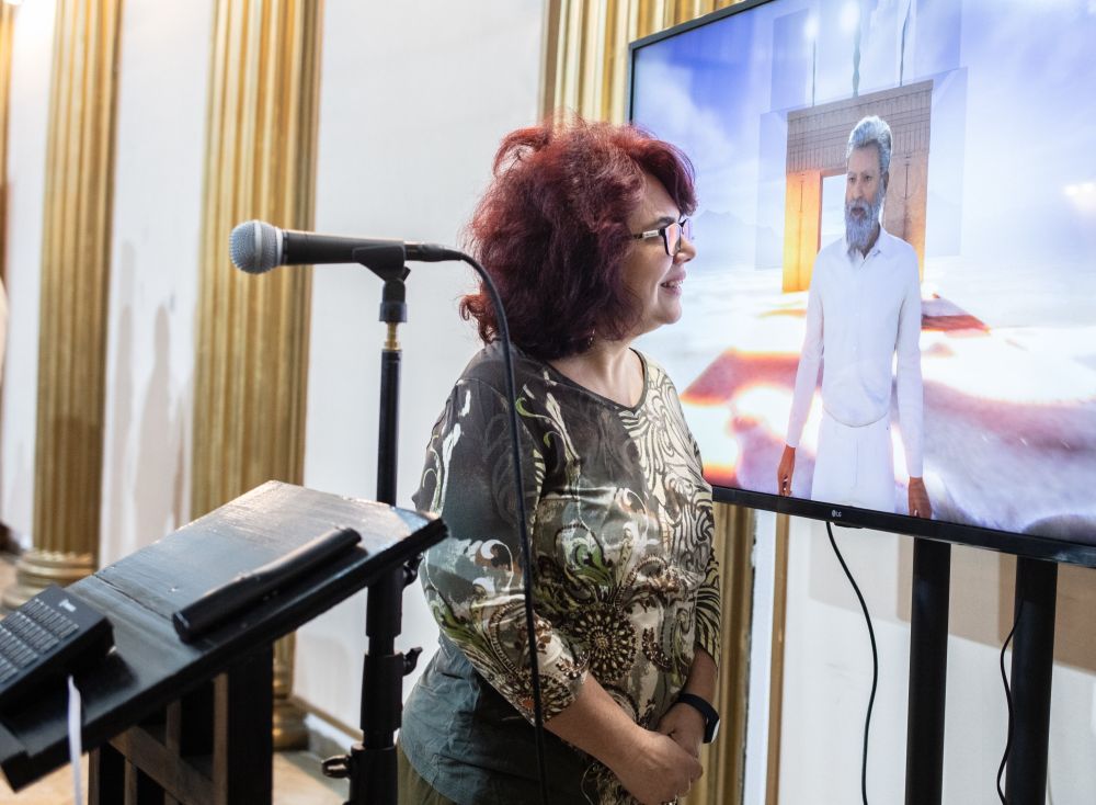 Doamna Rodica Mocanu a simțit, de asemenea, sacralitatea cu care este încărcat spațiul expozițional, realizând că aici sunt reprezentate, simbolic, epocile civilizației: epoca de piatră, epoca de fier și epoca de bronz (natura fiind reprezentată prin lemn). Mai există și o altă epocă, mai discretă, în afara acestui spațiu sacru, și anume „epoca digitală”. Cum artiștii au adoptat mereu prima tehnologie care apărea în timpul lor, este firesc să se ajungă astăzi la artă digitală, care nu este neapărat frumoasă, ci interesantă și spectaculoasă. Aceasta schimbă însă unele aspecte, cum ar fi auctorialitatea, piața artei și mijloacele de expresie. Întâmpină și dificultăți privind arhivarea, circulația și vizualizarea. Ținând cont că aceste tehnologii moderne ne-au afectat pe toți, rămâne de văzut modul în care o va face și arta digitală. Efectele se văd mai ales în rândul generației tinere, deoarece „omul s-a schimbat, gândește altfel, în alt ritm și are alte așteptări”. În acest mod, domnia sa a făcut trecerea spre prezentarea celor „două produse digitale”, rezultat al cercetărilor domnului Florin Marc, care la bază este inginer, dar cu studii de sculptură și de artă digitală, actualmente doctorand în domeniul inteligenței artificiale și al realității virtuale, la Scoala Doctorală de Teatru și Film UBB Cluj-Napoca (unde doamna Rodica Mocan este profesor).