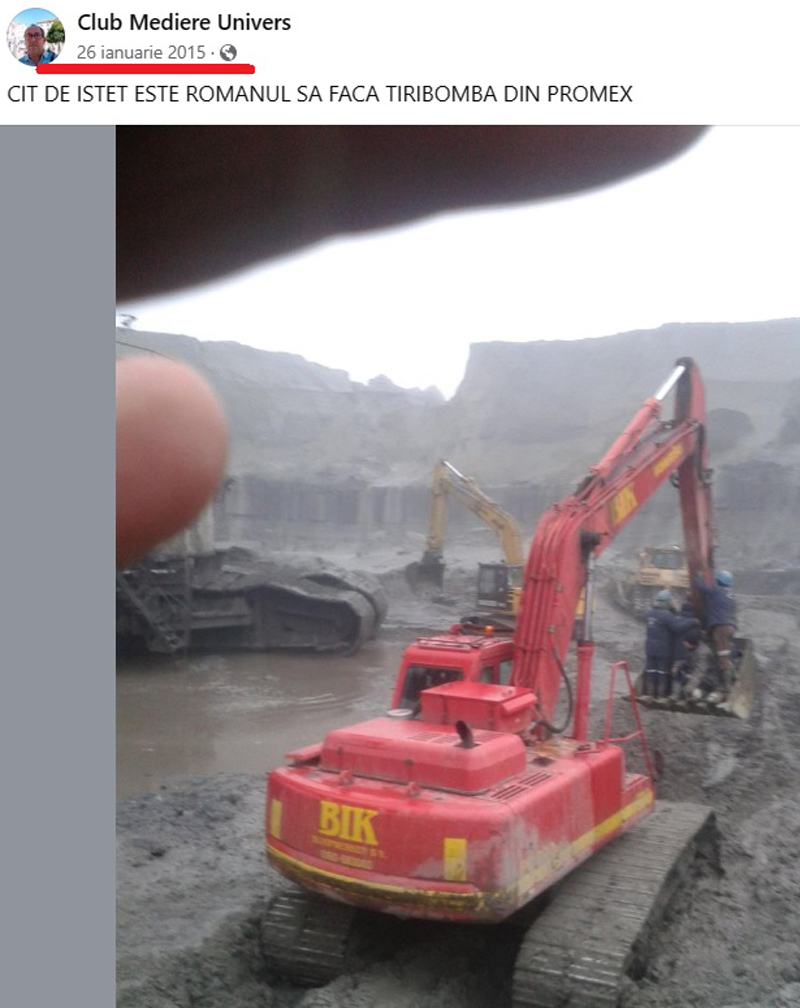 După tragicul accident din Cariera Jilț Sud a Complexului Energetic Oltenia (CEO), în urma căruia trei salariați ai companiei și-au pierdut viața și alți zece au fost răniți, mediul online s-a umplut de fotografii și filmulețe în care apărea noroiul din carierele de lignit sau condițiile vitrege de muncă ale angajaților producătorului energetic. Cele mai multe dintre acestea redau, fără echivoc, climatul impropriu de muncă, însă, la finele săptămânii trecute, pe fondul emoțional al accidentului, urmat de măsura sistării activității de transport, a apărut, în aproape toată presa din România, o imagine cu câțiva mineri transportați în cupa unui excavator, iar relatările induceau ideea că fotografia a fost realizată joi, 26 ianuarie 2023, în contextual în care minerii nu mai aveau altă soluție să ajungă la punctul de lucru. De fapt, fotografia a fost publicată, în mediul online, pe 26 ianuarie …2015, adică în urmă cu exact opt ani!