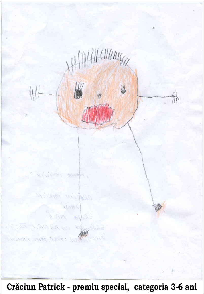 Primul premiu, unul special, a fost oferit, la categoria 3-6 ani, ,,celui mai expresiv” participant. Este vorba despre Patrick Crăciun, în vârstă de 3 ani, concurentul fiind preșcolar la Grădinița cu Program Prelungit nr.1 Târgu-Jiu, la grupa mică.