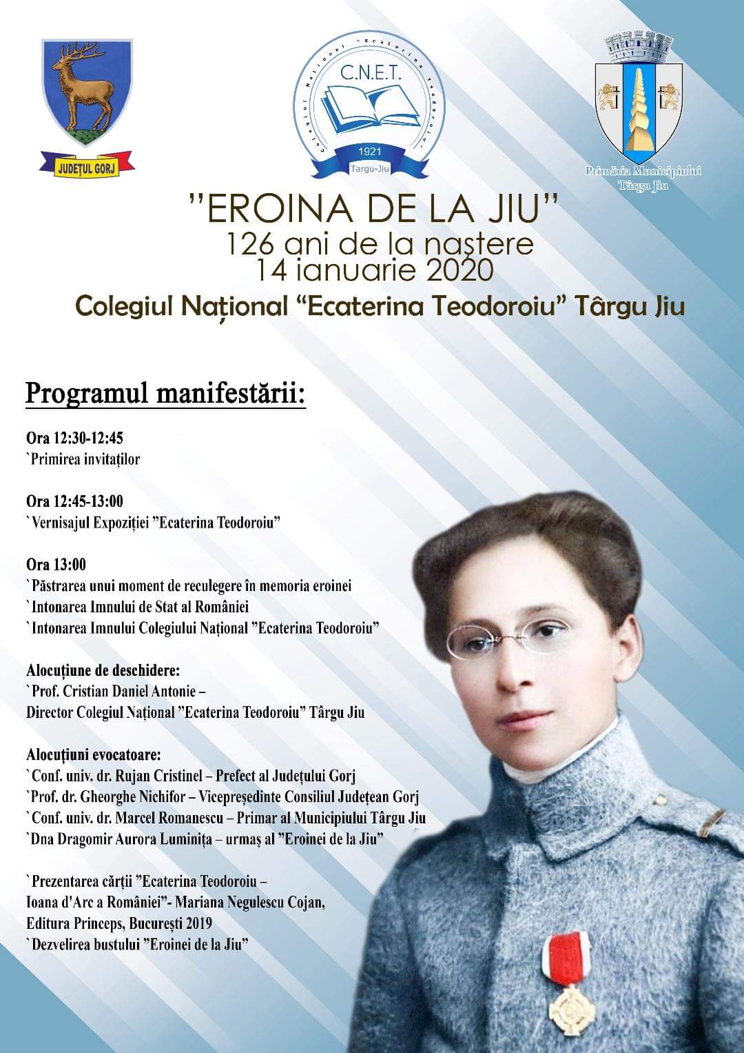 Marți, 14 ianuarie 2020, orele 12,30, Colegiul Național ”Ecaterina Teodoroiu” Târgu Jiu va găzdui o manifestare dedicată împlinirii a 126 ani de la nașterea Ecaterinei Teodoroiu, numită și ”Eroina de la Jiu”.