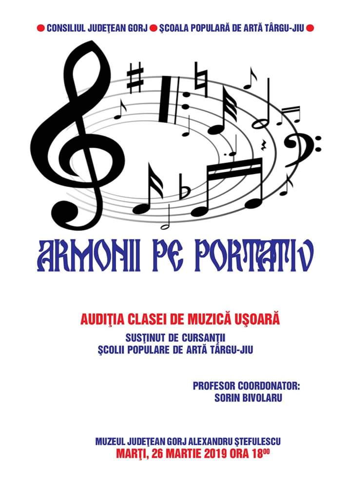 Sub genericul „Armonii pe portativ”, Școala Populară de Artă Târgu jiu, instituție aflată în subordinea Consiliului Județean Gorj, vă invită marți, 26 martie, de la ora 18:00, la Muzeul Județean Gorj „Alexandru Ștefulescu”, să participați la un minispectacol de muzică ușoară, unde vor evolua cursanții instituției noastre, coordonați de prof. Sorin Bivolaru.
