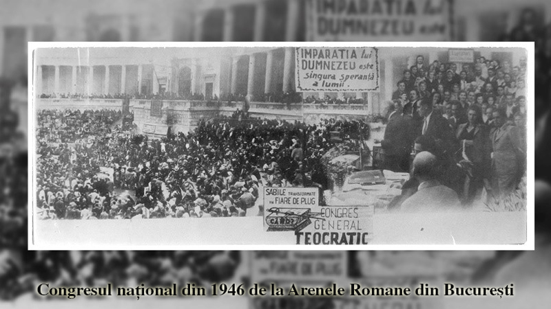 În zilele de 28 și 29 septembrie 1946, Martorii lui Iehova au ținut primul lor congres național în România, la Arenele Romane din București. Tema congresului a fost: „Săbiile transformate în fiare de plug”, făcându-se aluzie la cartea biblică Isaia, capitolul 2, versetul 4. Direcțiunea Căilor Ferate Române a fost de acord să pună la dispoziție un tren special pentru delegații la congres și chiar să reducă cu 50% costul biletului. Trenul a adus în capitală peste 1.000 de delegați din cele mai îndepărtate colțuri ale țării. Mulți purtau pancarte mari, stârnind curiozitatea oamenilor pe parcursul călătoriei. Sâmbătă, 28 septembrie 1946, la prima sesiune a congresului, asistența a fost de 3.400 de persoane. Duminică după-amiază, la ultima sesiune a acestuia, dl. Martin Magyarosi, unul dintre organizatori, a spus: „Astăzi, la Paris se desfășoară Conferința pentru pace a Marilor Puteri. Aici, sunt 15 000 de persoane. Dacă vom căuta, nu vom găsi nici sabie, nici pistol la vreunul dintre Martorii lui Iehova prezenți aici. De ce? Pentru că noi am transformat deja săbiile în fiare de plug!”. Cu acea ocazie, au fost prezenți procurorul general al României, unul dintre secretarii ministrului de interne, mai mulți ofițeri și comisari de politie și un grup de preoți ortodocși.
