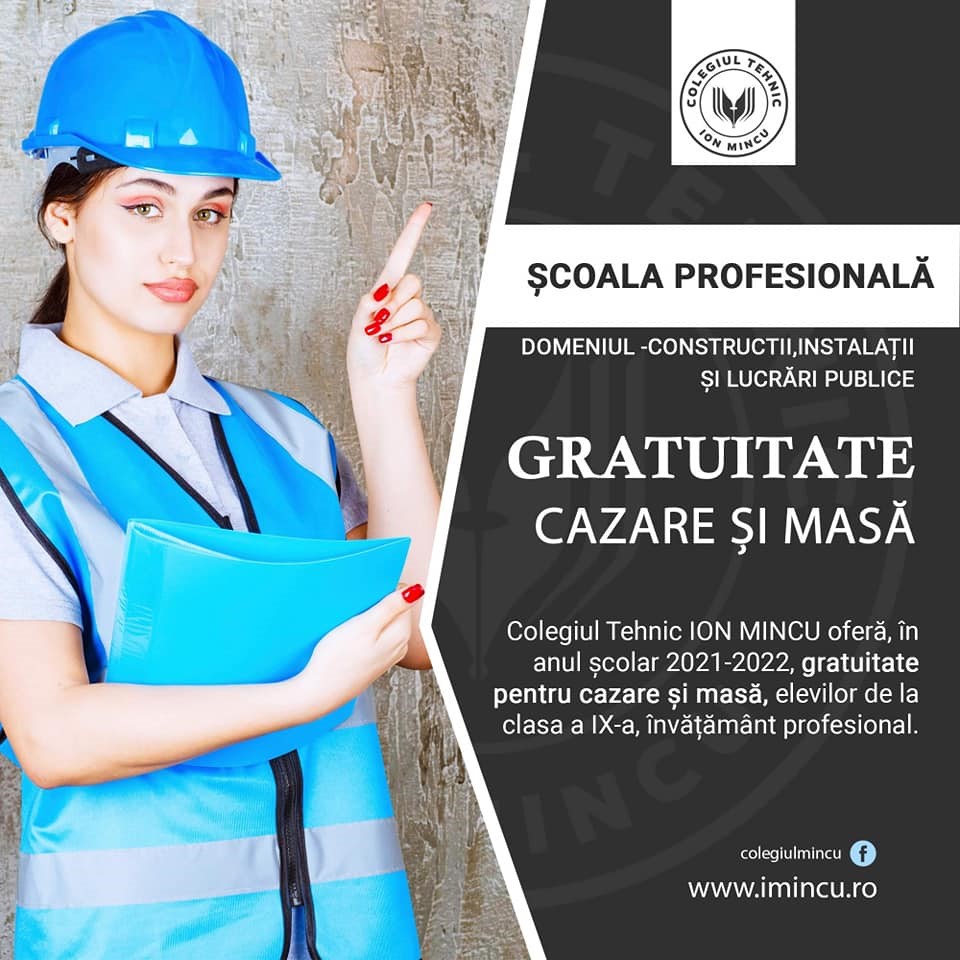 Colegiul Tehnic ”Ion Mincu” din Tg-Jiu oferă cazare și masă gratuite elevilor din clasa a IX-a, învățământ profesional, începând cu anul școlar următor. Se școlarizează următoarele calificări profesionale: Domeniul Construcții, instalații și lucrări publice – Mozaicar; Domeniul Turism – Lucrător hotelier. Mai multe detalii sunt disponibile pe site-ul unității de învățământ, imincu.ro.