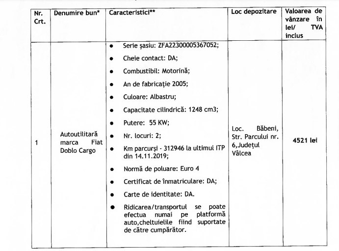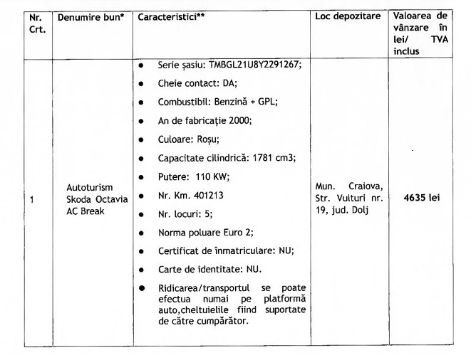 ANAF are la vânzare un autoturism Skoda Octavia AC Break, an fabricație 2000, și o autoutilitară Fiat Doblo Cargo din 2005. Prețurile de vânzare depășesc cu puțin suma de 4.500 de lei. Valorificarea bunurilor se va face în