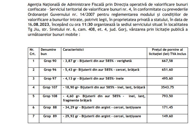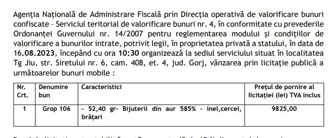 Iar săptămâna viitoare, fiscul scoate la vânzare mai multe bijuterii din aur și argint. Este vorba de inele, cercei, brățări și lănțișoare. Acestea se vând pe loturi (grupuri).