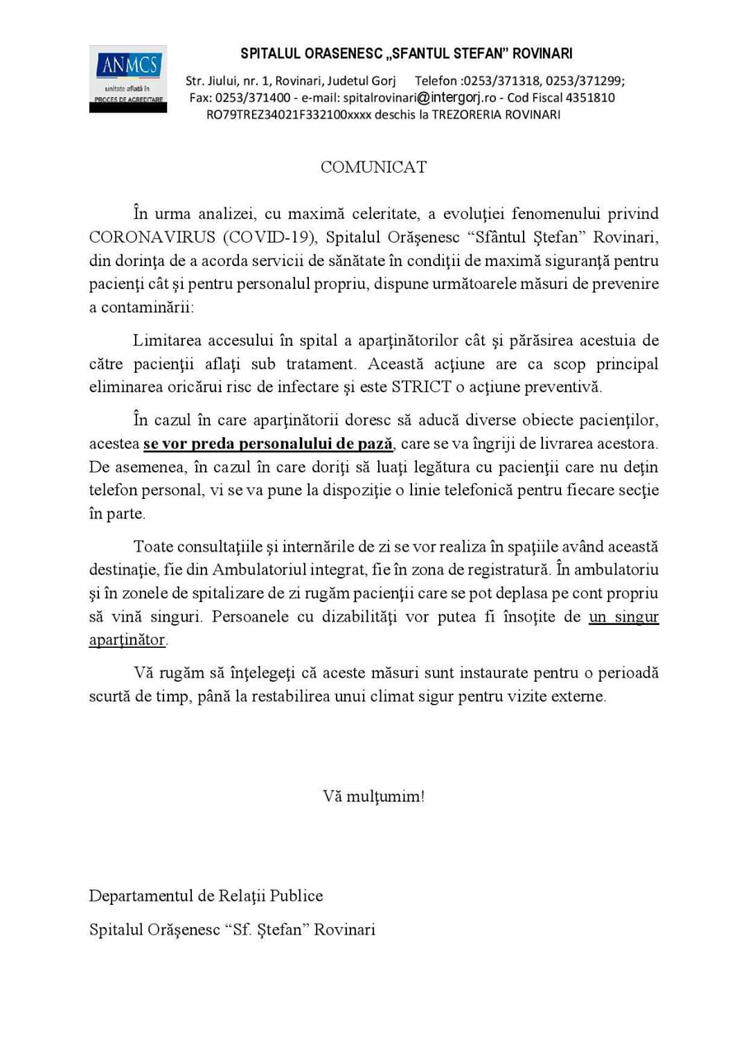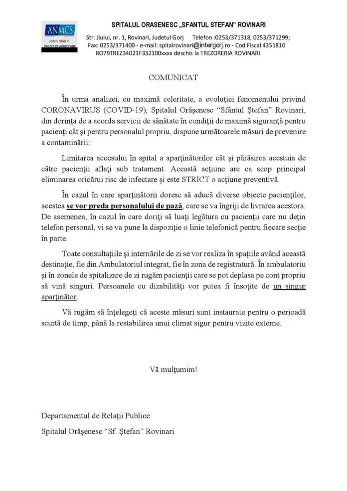 Măsuri stricte, la Spitalul Orășenesc Rovinari