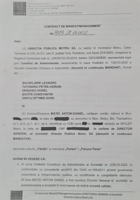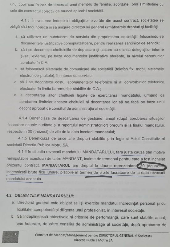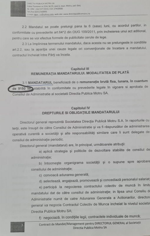 După un an de mandat s-a intrat în posesia contractului de mandat ale membrilor CA și ale directorului general unde, fără a avea indicatori, respectivii aveau indemnizații de 1540 de lei pentru CA lunar și 20 de indemnizații brute dacă sunt schimbați în perioada de mandat fără motiv, adică 30.800 de lei garanție. Culmea este că fostul director are aceiași clauză de 20 de salarii brute daca este schimbat, asta însemnând o garanție de 190.000 de lei.