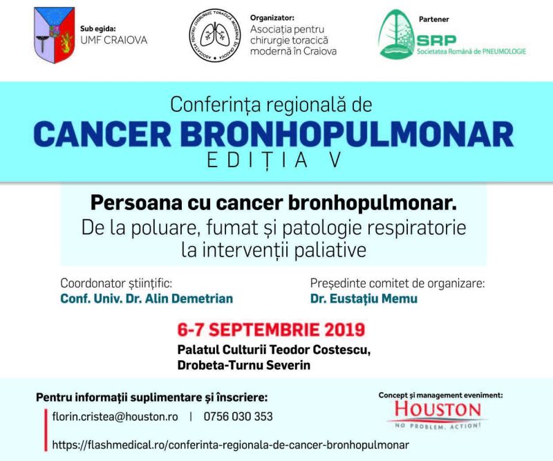 În perioada 6 – 7 septembrie 2019 (vineri și sâmbătă), cadrele medicale sunt așteptate la Drobeta Turnu Severin, în cadrul Palatului Culturii ,,Teodor Costescu”, pentru a face echipă în lupta cu singurul tip de cancer cu mortalitatea în creștere: cancerul bronhopulmonar! Taxa este redusă până pe 19 august 2019, iar pe site-ul oficial al evenimentului se pot găsi detalii cu privire la taxe și modalitățile de înscriere! Conferința de Cancer Bronhopulmonar, ediția a V-a, este coordonată științific de Conf. univ. dr. Alin Demetrian, președintele Asociației de Chirurgie Toracică Modernă din Craiova, iar președintele comitetului de organizare este dr Eustațiu Memu, medic cu specialitatea chirurgie toracică în Drobeta Turnu Severin. Evenimentul se desfășoară sub egida UMF Craiova, iar Societatea Română de Pneumologie este partener.,,Temele conferinței fac referire la semnele și simptomele care ar trebui să atragă atenția asupra posibilității existenței acestui diagnostic – cu focus pe medicina de familie, la alte patologii cu care trebuie făcut diagnostic diferențial, la statusul programului ,,stop fumat” în România și intervențiile medicale, chirurgicale și paliative la care se poate recurge.
