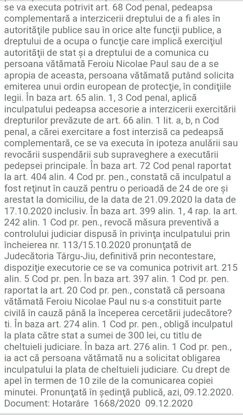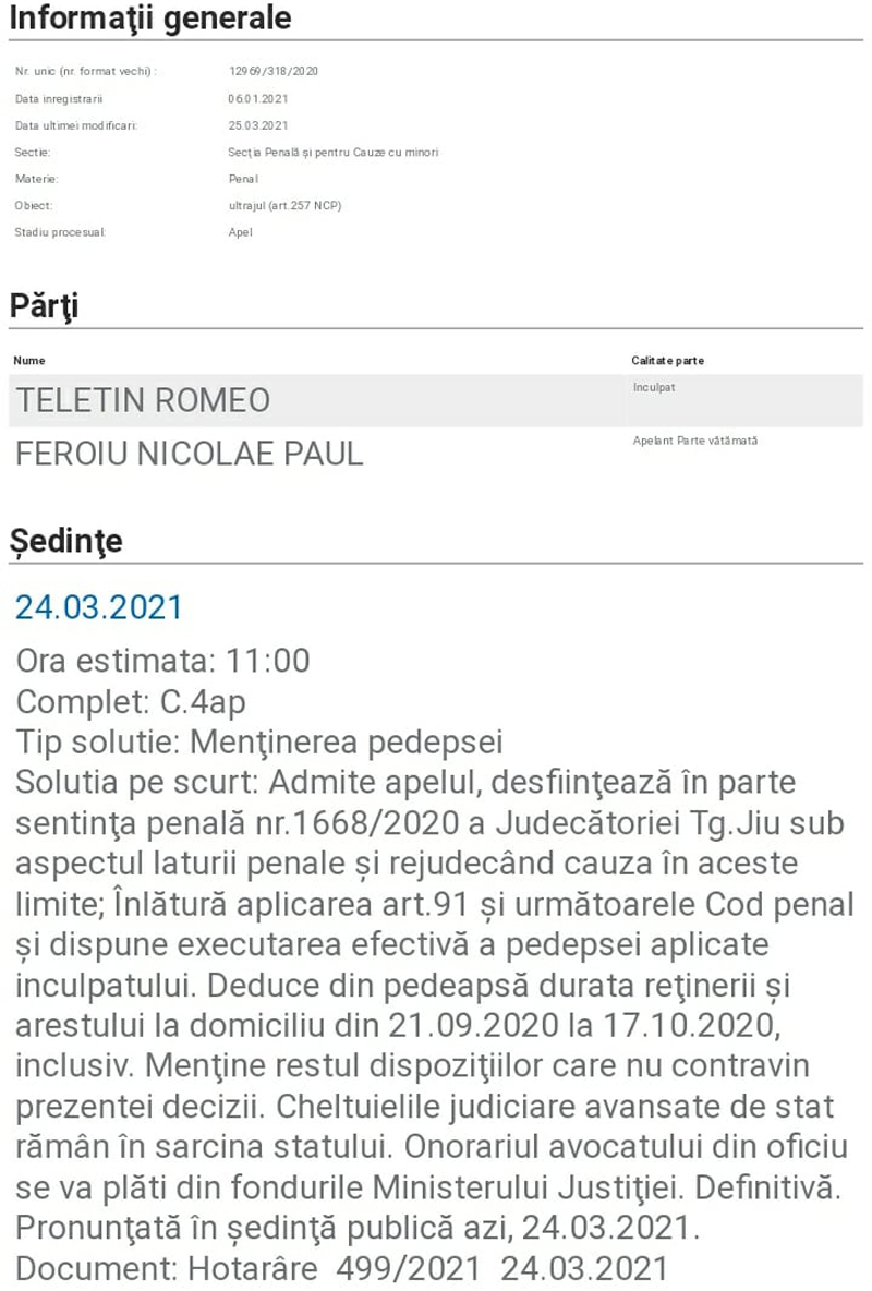 Polițistul a atacat sentința la Curtea de Apel Craiova, iar pe 24 martie instanța a impus executarea pedepsei de 9 luni și a amenzii penale, din care a dedus perioada arestului domiciliar al inculpatului, pe perioadă 21 septembrie – 17 octombrie. Hotărârea nr. 499 a Curții de Apel Craiova a rămas definitivă, la recursul declarat de polițistul Feroiu.