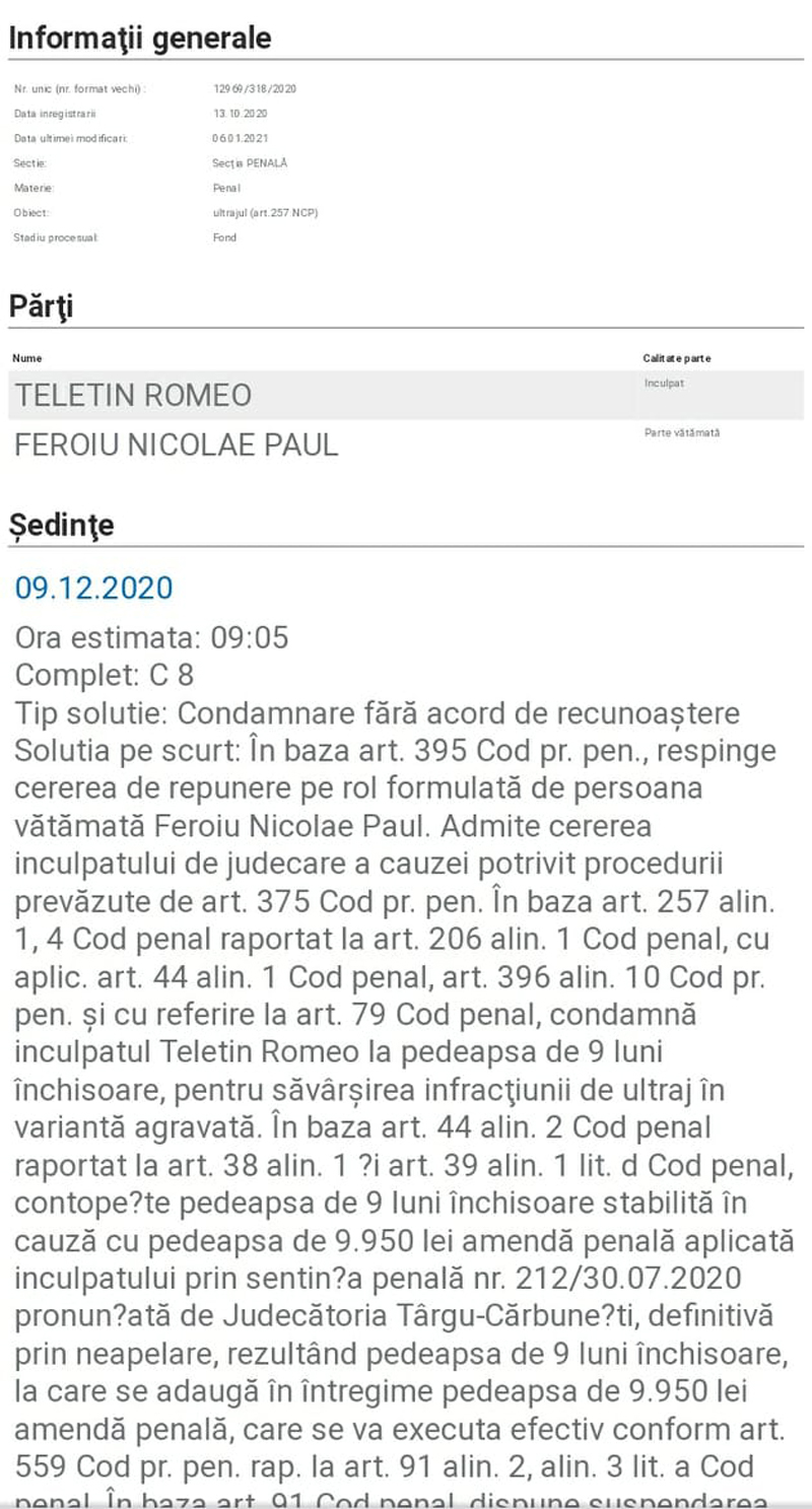 Fapta s-a petrecut anul trecut iar instanța de fond, pe 9 decembrie, a dat nouă luni cu suspendare și o amendă penală în valoare 9950 de lei pentru inculpatul Telentin Romeo.