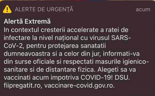 În contextul creșterii accelerate a ratei de infectare la nivel național cu virusul SARS-CoV-2, pentru protejarea sănătății dumneavoastră și a celor din jur, informați-vă din surse oficiale și respectați măsurile igienico-sanitare și de distanțare fizică. Alegeți să vă vaccinați acum împotriva COVID-19!„, transmite DSU.