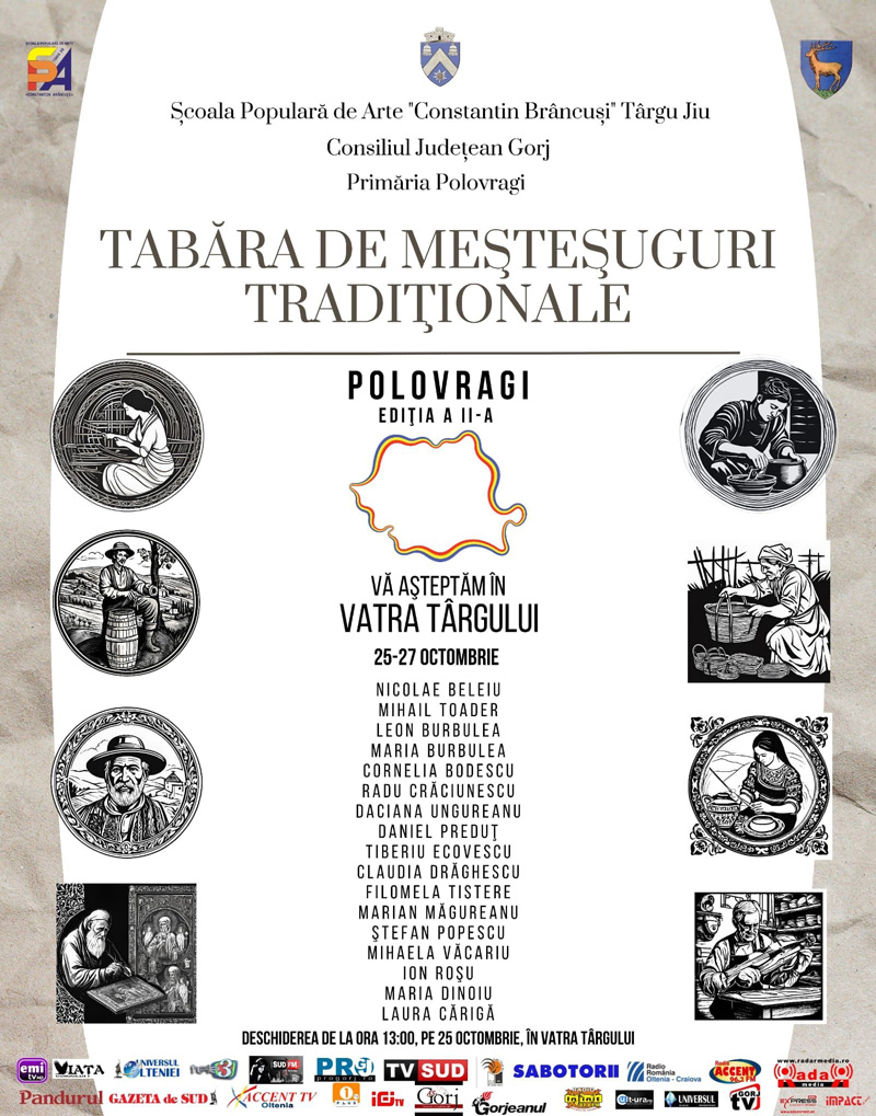 Pe parcursul celor trei zile, în atmosfera rustică a Vetrei Târgului, participanții vor avea oportunitatea de a interacționa direct cu artizani talentați și dedicați, care duc mai departe moștenirea primită de la înaintașii lor. Acești meșteri populari, adevărați păstrători ai tradițiilor, veniți din mai multe zone etnografice ale Gorjului, dar și din Bistrița-Năsăud și Alba, vor împărtăși din cunoștințele și experiența lor, oferind tinerilor șansa de a descoperi frumusețea și complexitatea meșteșugurilor românești. Participanții vor avea ocazia să se inițieze în artele țesutului, cusutului, prelucrării lemnului, olăritului, picturii pe ceramică, confecționării de tulnice, prelucrării pieilor. Fiecare atelier promite nu doar o lecție de meșteșug, ci și o poveste despre patrimoniul cultural al regiunii. Deschiderea oficială a evenimentului este programată pentru vineri, 25 octombrie 2024, începând cu ora 13:00, când vor avea loc și primele ateliere de creație. De asemenea, sâmbătă, 26 octombrie sunt programate o altă serie de ateliere și demonstrații practice, iar în data de 27 octombrie va avea loc expoziția finală și închiderea taberei. Tabăra de Meșteșuguri Tradiționale de la Polovragi reprezintă o oportunitate valoroasă pentru participanți de a se conecta cu moștenirea culturală a trecutului și de a-și dezvolta abilitățile creative. Evenimentul, desfășurat sub auspiciile Consiliului Județean Gorj, face parte din Festivalul Internațional de Cultură și Tradiții, proiect multicultural inițiat de Asociația Europeană pentru Promovarea Turismului și Tradițiilor TraciaLand, cu sprijinul Primăriei Polovragi.