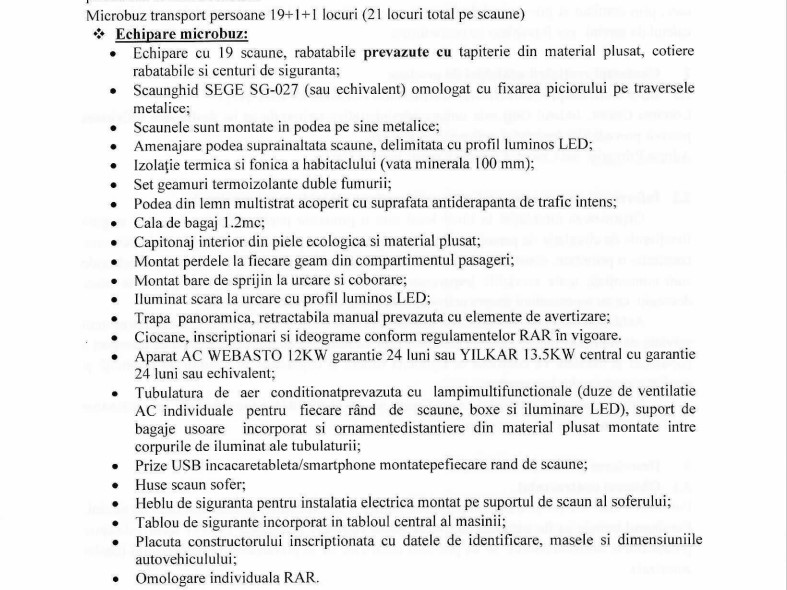 Potrivit caietului de sarcini, motorul microbuzului va fi Diesel, cu normă de poluare Euro 6. Anul de fabricație al microbuzului trebuie să fie 2021. În plus, furnizorul trebuie să asigure o garanție de 3 ani, indiferent de numărul de kilometri parcurși.