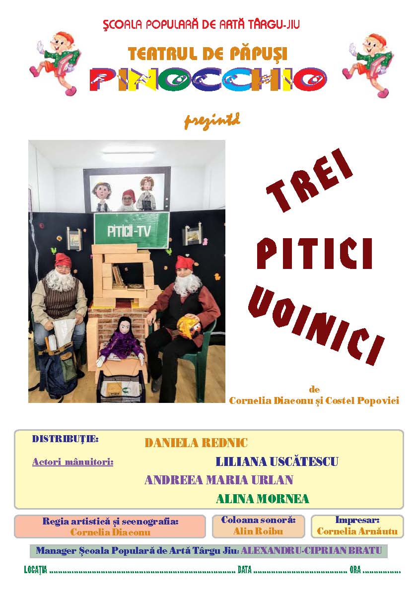 Piesa ,,Trei pitici voinici” se vrea o alternativă la prea multă tehnologie, pentru că odată cu ascensiunea mijloacelor moderne de comunicare, tindem să dăm din ce în ce mai puțină importanță cititului. În urma întâlnirii cu personajele, precum: cei trei pitici, Marinică și asistenta, copiii vor învăța că trebuie să se joace, să creeze, să-și dorească să citească o carte și abia apoi, cu un vocabular frumos și bogat, să apeleze la tehnologie pentru a-și desăvârși educația. Spectacolul este unul energic, din piesă nu vor lipsi dansurile și cântecelele. „Vă așteptăm pe toți, cu mic cu mare, să vă bucurați de clipe minunate alături de trupa de păpușari profesioniști ,,Pinocchio”. Intrarea este liberă, în limita locurilor disponibile!”, au anunţat reprezentanţii Şcolii Populare de Artă Târgu-Jiu.