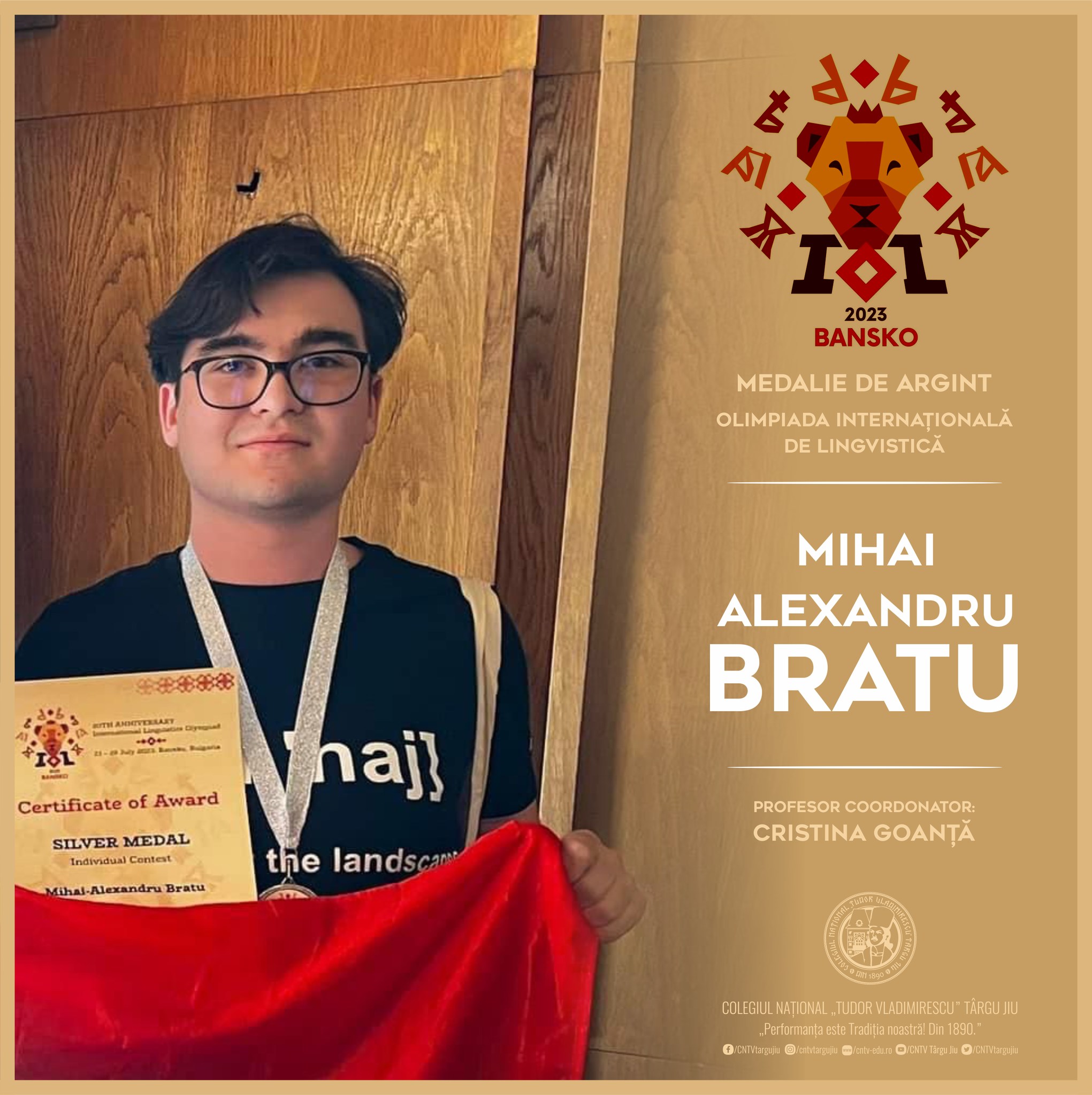 „Felicitări din tot sufletul elevului nostru, Mihai-Alexandru Bratu, pentru rezultatul excepțional obținut la Olimpiada Internațională de Lingvistică: MEDALIE de ARGINT! Un nou premiu care onorează munca ta extraordinară și școala pentru care vei fi mereu un model!  Prof. coord. Cristina Goanță”, a transmis Colegiul Național „Tudor Vladimirescu”.