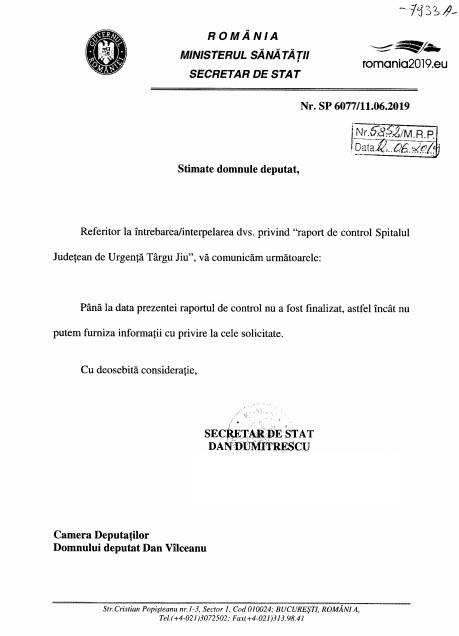 Este de-a dreptul halucinant cum au evoluat lucrurile la Spitalul Județean de Urgență (SJU) Târgu-Jiu, de la finele lunii martie, atunci când ministrul Sănătății, Sorina Pintea, și-a exprimat, public, nemulțumirile, în urma vizitei inopinate pe care a făcut-o la unitatea medicală, după scandalurile uriașe în care a apărut instituția, la începutul acestui an. Ministerul Sănătății i-a comunicat, oficial, deputatului liberal Dan Vîlceanu, pe 11 iunie a.c., că raportul de control nu este finalizat, în contextul în care, cu exact trei săptămâni înainte, ministrul Sorina Pintea declarase, în cadrul unei conferințe de presă, că ,,Am rezultatele controlului de la spitalul din Târgu-Jiu”. Cine minte, totuși, cu privire la raportul de control de la SJU Târgu-Jiu? În tot acest timp, în care oficialii Ministerului Sănătății o dau în bară, încercând să dreagă situația, adică să ascundă concluziile raportului, la unitatea spitalicească de la Târgu-Jiu șmenurile continuă ca și cum nici ministrul Pintea și nici Corpul de Control al acesteia n-au călcat prin instituție.