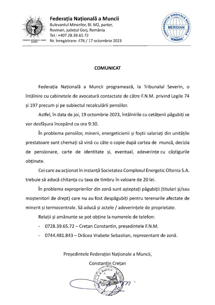 Amintim că federația condusă de Constantin Crețan s-a implicat pentru a-i sprijini pe minerii și energeticienii CEO, în procesele pe care aceștia le intentează pentru a-și recupera, în instanță, drepturile bănești conferite de lege.