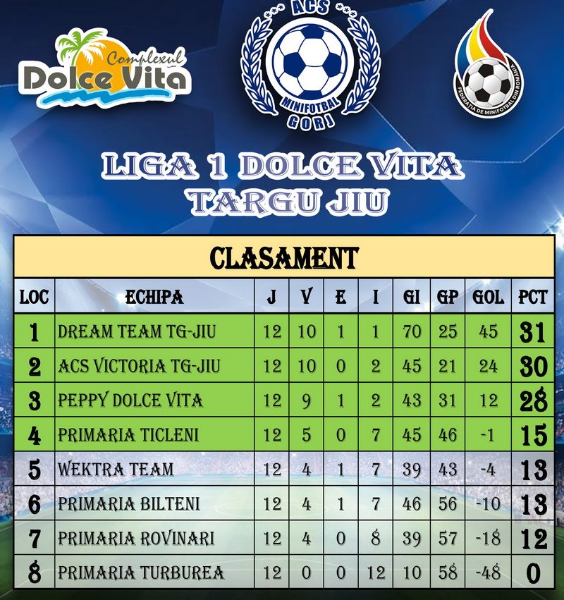 În weekend-ul recent încheiat s-au jucat meciurile etapei a 12-a din sezonul regulat al Ligii 1 Dolce Vita la minifotbal. Campioana ultimelor sezoane, Dream Team Târgu-Jiu, ocupă fotoliul de lider, urmată de ACS Victoria Târgu-Jiu și Peppy Dolce Vita. Toate cele 3 rivale la titlul de campioană au obținut victorii în această etapă. Dream Team s-a impus în duelul cu Wektra Team, păstrând avansul de un punct în fața celor de la ACS Victoria.