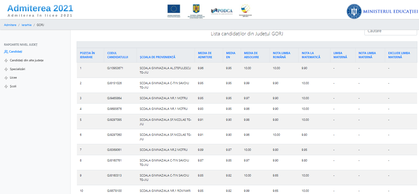Ierarhia mediilor de admitere la liceu, la nivel judeţean și la nivelul municipiului București, a fost publicată de Ministerul Educației, pe site-ul admitere.edu.ro. În Gorj, cea mai mare medie de admitere este 9,96 și aparține unui candidat de la Școala Gimnazială ”Alexandru Ștefulescu” Târgu-Jiu. Urmează doi candidați cu media 9,95, unul de la Școala Gimnazială ”Constantin Săvoiu” Târgu-Jiu, iar celălalt de la Școala Gimnazială Nr. 1 Motru. Mâine va debuta prima etapă de etapă de repartizare computerizată și admitere în învățământul liceal de stat pentru candidații din seria curentă, precum și pentru cei din seriile anterioare care nu împlinesc 18 ani până la data începerii cursurilor anului școlar 2021-2022.