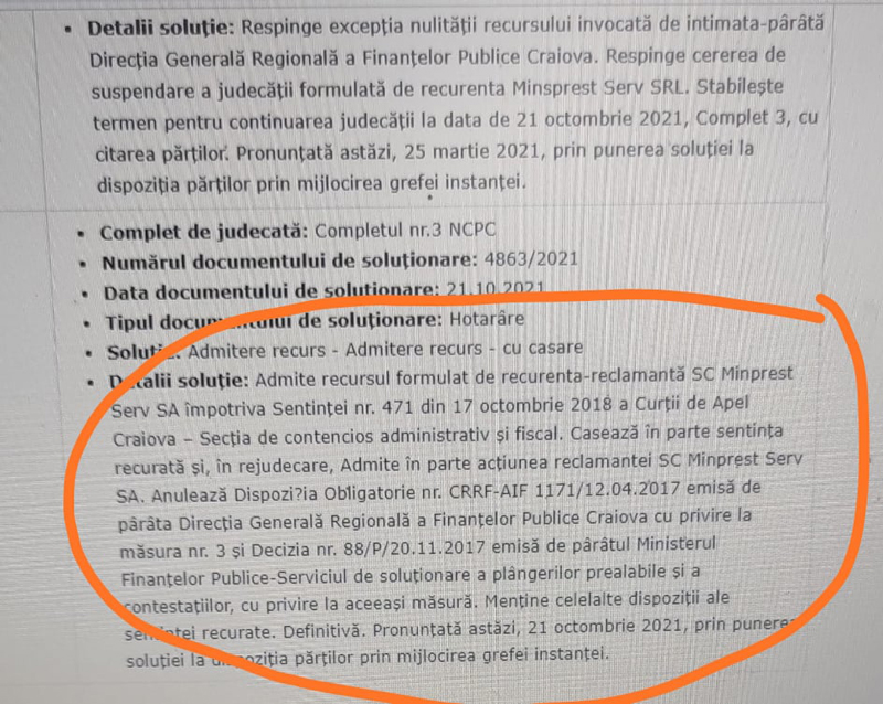 Mai mult decât atât, am ajuns să fiu dat în judecată, personal, de către Minprest, la solicitarea CA-ului, pentru a plăti eu și alți 18 colegi prejudiciul constatat anterior de ANAF, prejudiciu care s-a dovedit că nu există. Interesant este că CA-ul nu a așteptat sentința Înaltei Curți, ci a preferat să ne indice vinovați pentru ceva fără fundament. Mă bucur că instanța Înaltei Curți a făcut însă dreptate și sper să se termine această vânătoare absurdă la adresa mea”, a declarat Gabriel Giorgi, fostul director Minprest. Sentința Înaltei Curți din 21 octombrie este definitivă. De altfel, instanța acceptă recursul declarat de Minprest în 2018 și casează soluția dată de Curtea de Apel Craiova (procesul fiind câștigat atunci de ANAF).