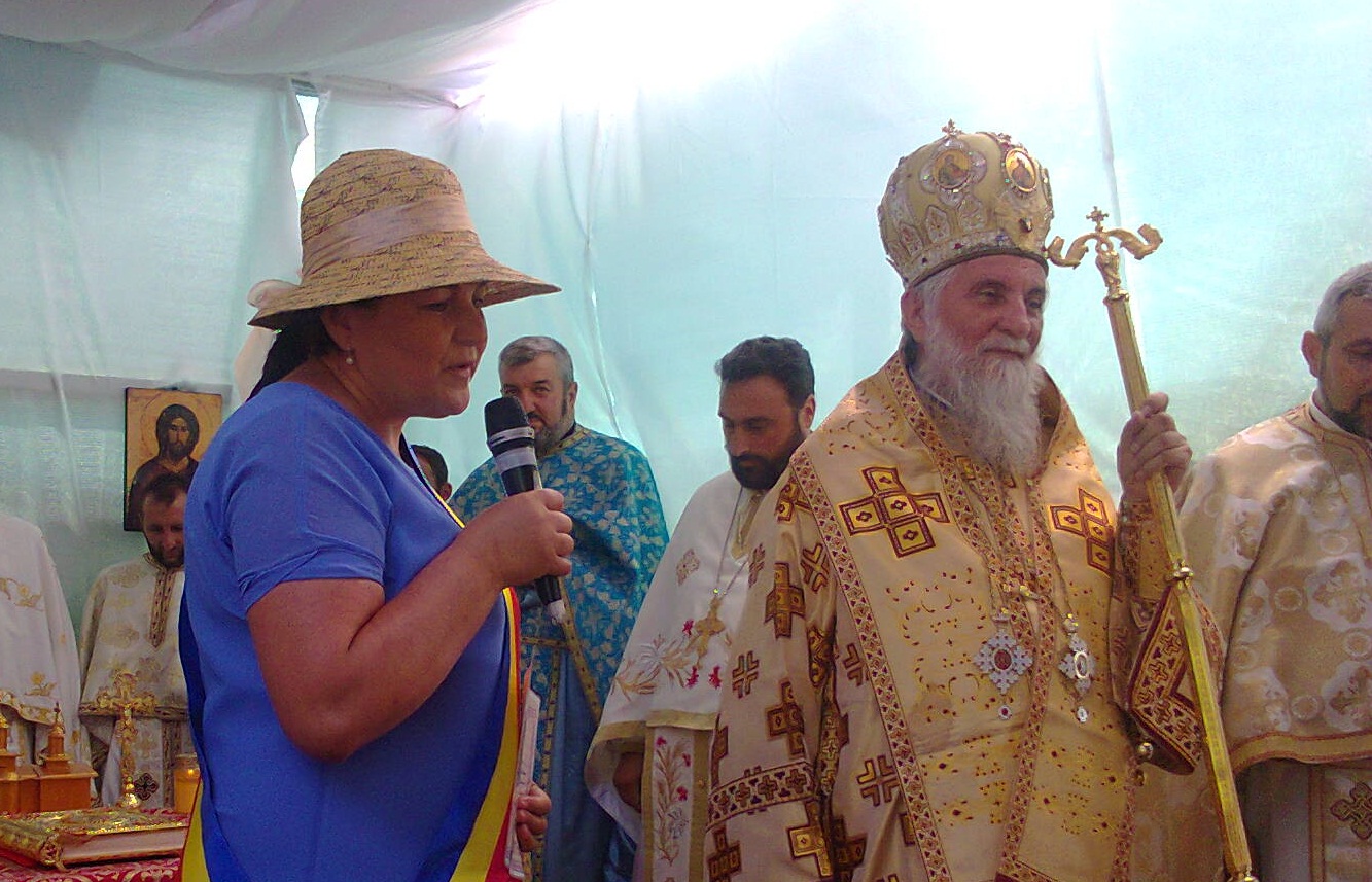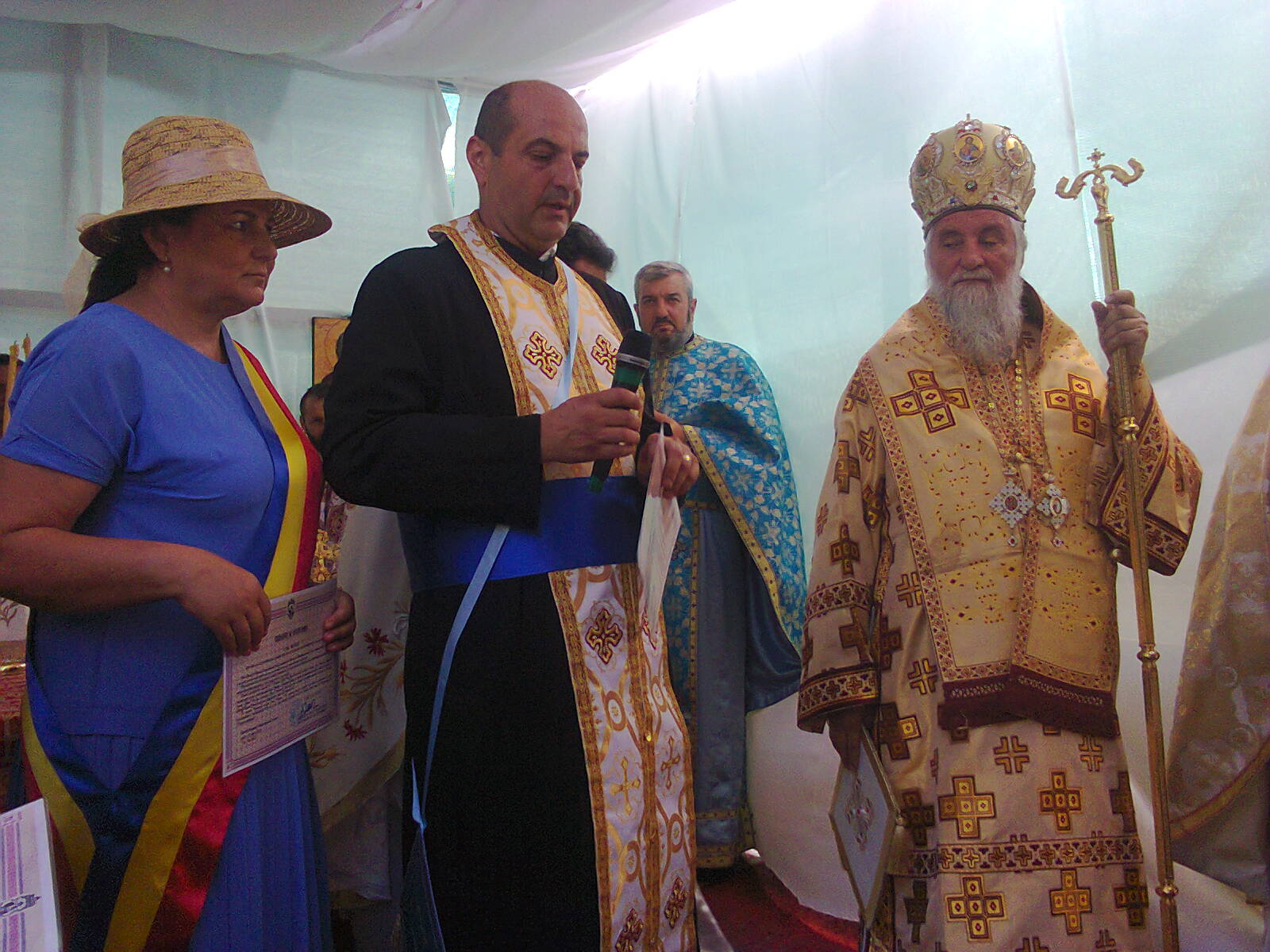 Cu multă rugăciune smerită, a fost conferit Preacucernicului Preot Paroh, Părintele Munteanu Vasile, rangul bisericesc de iconom şi în cele din urmă au fost acordate gramate chiriarhale de mulţumire următoarelor persoane: doamna primar Cojocaru Irina, precum şi domnilor Cosoroabă Gheorghe, Creţoiu Petrică, Dobroiu Virgil, Dobre Pistol Alexandru. Uşor marcat de o emoţie firească, Preacucernicului Preot Paroh, Părintele Vasile Munteanu a spus cu glasul său plin de elocinţă: ,,Micuţa noastră parohie resfinţeşte astăzi biserica şi le mulţumesc tuturor, vă mulţumesc dumneavoastră, dragi enoriaşi, care v-aţi implicat, ca şi doamnei primar, care ne-a susţinut cu mult suflet! Într-o perioadă destul de scurtă, am reuşit să facem şi prăznicarul! Vă mulţumesc tuturor şi Îl rog pe Bunul Dumnezeu să vă întoarcă tot sprijinul acordat nouă! Amin”. Orecum sfioasă şi plină de sensibilitate, Doamna primar Cojocaru Irina a ţinut foarte mult ca să se adreseze celor prezenţi şi să spună: ,,Mulţumesc Înaltpreasfinţitului Părinte Mitropolit Irineu, tuturor părinţilor şi enoriaşilor care ne-au sprijinit şi cred că am reuşit să le fim întotdeauna aproape ca să-i ajutăm pentru rezolvarea problemelor! Vă mulţumesc tuturor pentru efortul depus şi pentru că aţi participat, astăzi, la resfinţirea acestei biserici, iar, de câte ori aveţi ocazia, să poposiţi în localitatea noastră, care este o localitate frumoasă şi cu oameni harnici! Vă mulţumesc şi vă rog să-mi scuzaţi emoţiile”, dovedind că feminitatea constă în rafinamentul cuvintelor rostite și înnobilate de amprenta unui caracter feminin desăvârșit în baza căruia principiul feminităţii se manifestă prin tandreţe, sensibilitate, armonie, frumuseţe, puritate şi dăruire, ceea ce înseamnă că femeia poate fi definită utilizând cuvinte cheie precum ființa sau actualitatea care deține un a priori conferit de misterul existenţei, de tumultul vieţii de familie şi de acea emoție acre copleşeşte!