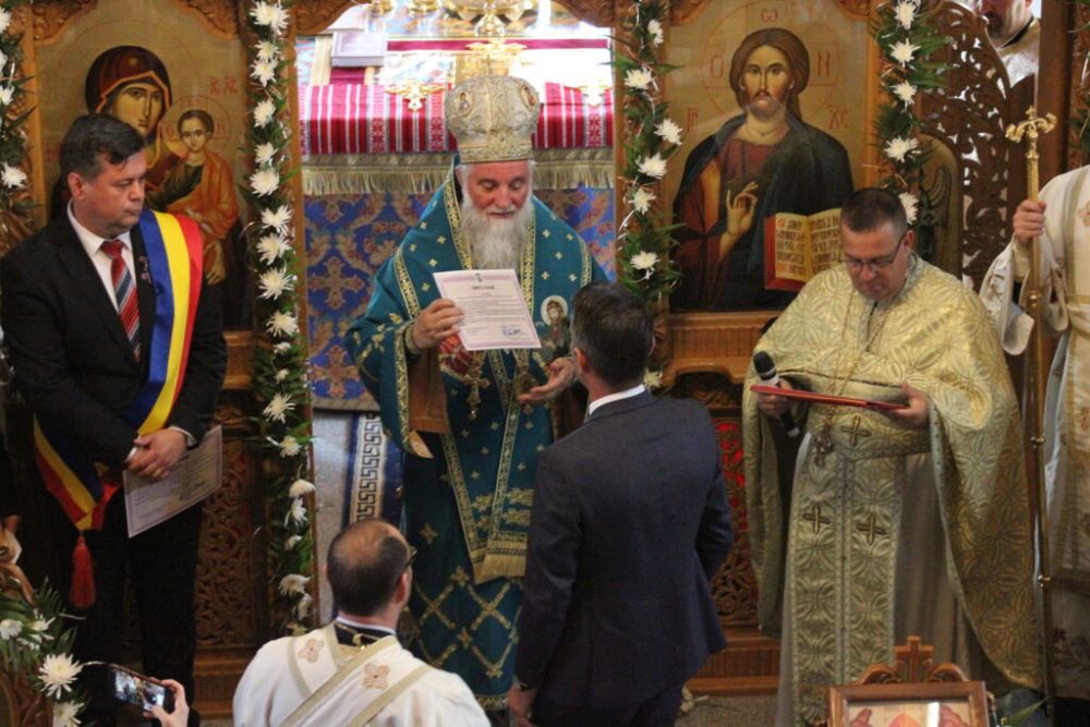 La slujba liturgică au cântat la strană membrii grupului psaltic al Catedralei Mitropolitane «Sf. Mare Mucenic Dimitrie» din Craiova. În cadrul slujbei Sfintei Liturghii, pentru activitatea pastoral-administrativă, părintele paroh Sandu Gheorghe și părintele slujitor Vasiloniu Liviu au fost ridicați la rangul de iconom stavrofor. În prezența oficialităților admistraţiei publice locale și judeţene, a unui număr impresionant de mare de credincioşi din parohie, din rândul cărora am remarcat prezenţa domnului Bebe-Viorel Ionică, Directorul Ziarului «Gorjeanul», la sfârşitul Sfintei Liturghii, Părintele protoiereu Ionel Cîmpeanu, de la Protopopiatul Târgu-Jiu Sud a dat citire actului de sfințire după care a spus că într-o zi de mare sărbătoare, această lucrare a omului a devenit «Casă a Lui Dumnezeu», iar, în continuare, Preacucernicul Părinte protoiereu a spus că în semn de apreciere, pentru sprijinul oferit lucrărilor de înfrumusețare a sfintei biserici, domnul primar Romanescu Marcel Laurențiu a primit gramata mitropolitană «Crucea Sfântului Nicodim» clasa I, pentru mireni. Au mai primit gramate chiriarhale de mulțumire din partea Mitropoliei Olteniei domnii: Dăianu Adrian, Besoi Ion Sorin, Cică Marian, Lișiță Irinel și Avram Albert Dorin. Pentru activitatea pastoral-administrativă şi de slujire sfântă, părintele paroh Sandu Gheorghe și părintele slujitor Vasiloniu Liviu au fost ridicați la rangul de iconom stavrofor. În cuvântul de mulţumire, Preacucernicul Părinte paroh, Sandu Gheorghe a ţinut să spună că ,,rugăciunile credincioşilor parohiei noastre au fost împlinite astăzi, de aceea, mulţumim tuturor celor care ne-au sprijinit şi pe care îi vom pomeni mereu în rugăciunile noastre”! Primarul Municipiului Târgu-Jiu a ţinut să menţioneze faptul că este o mare onoare pentru domnia sa primirea gramatei mitropolitane, acesta fiind cel mai înălţător moment de apreciere pentru comunitatea târgujiană, motiv pentru care va rămâne mereu în slujba Domnului şi a comunităţii pe care o reprezintă!