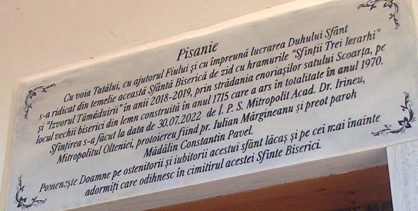 În ziua de sâmbătă, 30 iulie 2022, Înaltpreasfinţitul Părinte, Acad. dr. IRINEU, Arhiepiscopul Craiovei şi Mitropolitul Olteniei a sfinţit Biserica zidită între anii 2018-2020, având hramurile «Sfinţii Trei Ierarhi» şi «Izvorul Tămăduirii», la care Înaltul nostru Ierarh al «Valahiei Mici» a adăugat şi Hramul «Sfântul Ier. Grigorie Dascălul» (fost Mitropolit al Ţării Româneşti între 1823-1834), din Parohia Scoarţa, Protoieria Târgu-Cărbuneşti, judeţul Gorj. După sfinţirea bisericii într-un loc binecuvântat de Dumnezeu, pe care l-am putea numi un loc de poveste, a fost oficiată Sfânta Liturghie, împreună cu un sobor ales de preoţi şi diaconi din rândul cărora au făcut parte Părintele Protoiereu, Pr. Mărgineanu Iulian, lector univ. dr. Ion Sorin Bora, de la Biserica «Antim Ivireanu», Parohia Târgu-Cărbuneşti, directorul departamentului Teologie al Facultăţii de Teologie-Ortodoxă din Craiova, Pr. Paroh Pavel Mădălin Constantin, Parohia Scoarţa, Pr. Dulămiţă Dan, Parohia Târgu-Cărbuneşti, Pr. Stoichin Eliodor, Parohia Târgu-Jiu (Spital), Pr. Ştoflea Dumitru, Parohia Polovragi, Pr. Baciu Laurenţiu, Parohia Bârseşti, Pr. Popescu Paul-Ionuţ, Parohia Novaci-Hirişeşti, Pr. Miloşescu Iulian, Parohia Jupâneşti, Pr. Ianăşi Daniel, Parohia Budieni, Pr. Barză Ionuţ-Cosmin, Parohia Târgu-Jiu (Sf. Varvara), Pr. Dovleac Ilie, Parohia Târgu-Jiu (Spital) şi alţii. Răspunsurile la strană au fost date de către Grupul psaltic al Catedralei Mitropolitane «Sfântul Mare Muc. Dimitrie» din Craiova. Deşi a fost o zi de sâmbătă, lucrătoare, cum se spune, a surprins la modul cel mai plăcut numărul foarte mare al credincioşilor prezenţi pe acest acest «Deal al Golgotei» Gorjului, ceea ce înseamnă că dreapta noastră credinţă este mare şi se face şi mai puternică! Pentru contribuţia la ridicarea bisericii au fost acordate gramate chiriarhale de mulţumire domnului Primar Stamatoiu Ion şi domnilor: Miroiu Grigore, Blidaru Dumitru, Dulămiţă Cătălin, iar, pentru aportul său deosebit, Domnul Podaru Valentin a primit cea mai înaltă distincţie bisericească din Oltenia: «Crucea Sfântului Nicodim cel Sfinţit de la Tismana», din partea Mitropolitului Olteniei. Preotul Paroh,