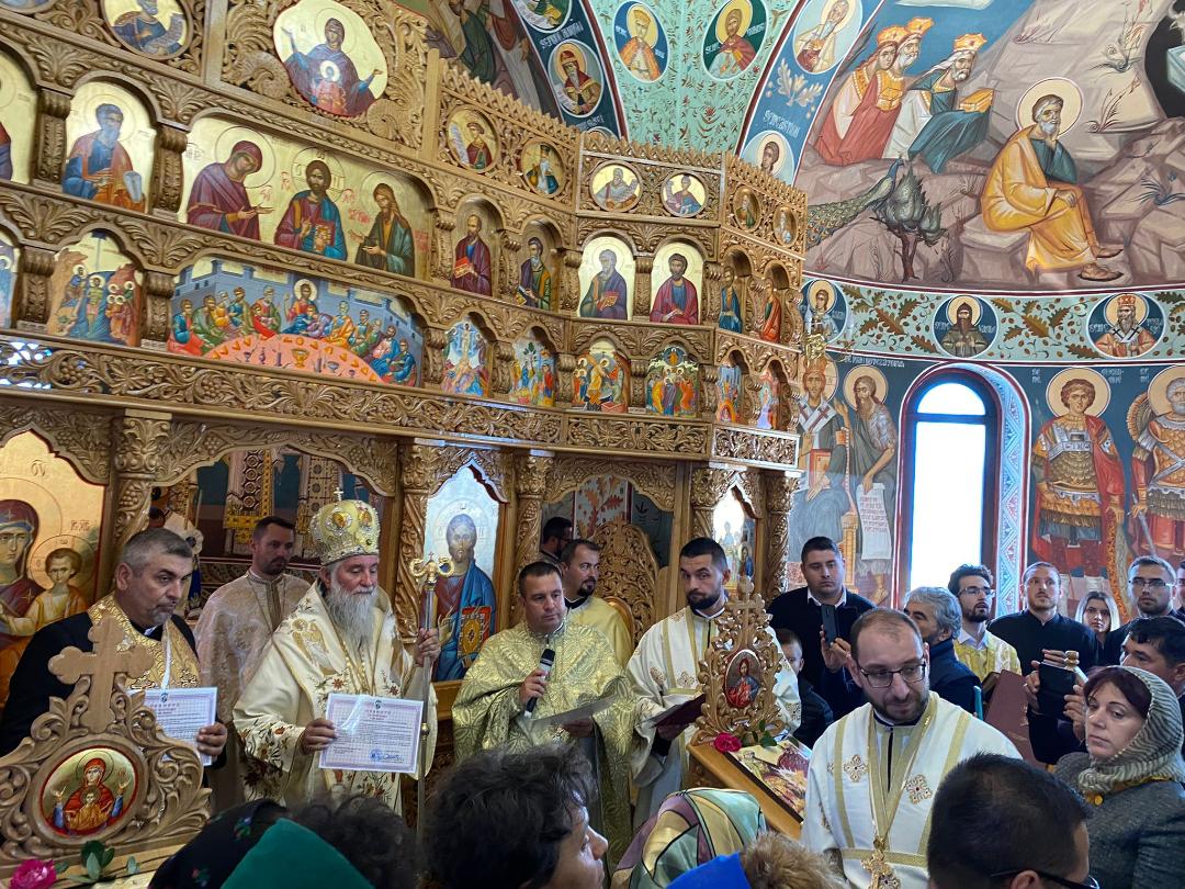 Dumnezeu a răspuns chemării noastre, rugăciunilor noastre la zidirea acestei biserici! Poate că unii dintre dumneavoastr au fost îndoielnici că vom realita acest lucru, dar, iată că acum, putem spune că Dumnezeu a biruit şi străduinţa noastră a fost răsplătită cu această «Casă a Lui Dumnezeu»! Biserica este, cum vedeţi, fraţilor şi surorilor, locul de închinare şi locul de întâlnire a noastră cu Dumnezeu! În sfânta biserică trebuie să venim întotdeauna, pentru că aici Îl întâlnim pe Dumnezeu!…..Aici, să fim pregătiţi a aduce lui Dumnezeu rugăciunile noastre, a aduce lui Dumnezeu viaţa noastră! De aceea, Crucea înseamnă renunţare, crucea înseamnă răstignire, crucea înseamnă despătimire! Pentru că Mântuitorul Hristos S-a răstignit pe Cruce pentru păcatele noastre, dar, ne cheamă la El ca să luăm şi noi crucea noastră, ca să mergem după El! Prin cuvintele acestea, Mântuitorul Hristos vrea să ne arate că fiecare dintre noi are o cruce de purtat. Pentru că unii oameni sunt încercaţi în lumea aceasta, cu multe suferinţe, cu multe dureri, iar, alţii au o viaţă mai uşoară! Unii, cum sunt sfinţii mucenici, de exemplu, şi-au dat sângele pentru Hristos, alţii au pătimit, au suferit, alţii au dus o viaţă plăcută lui Dumnezeu prin fapte bune! Tot ceea ce am primit de la Dumnezeu este pe măsura posibilităţilor şi a putinţei noastre de a le duce, că nu putem să luăm crucea altuia, nu putem să avem ceea ce luăm de la altul în viaţa noastră, ca să avem şi să râvnim crucea altuia, că numai pe a noastră trebuie să o ducem! Aşa cum spune Mântuitorul, fiecare «să-şi ia crucea sa şi să-mi urmeze Mie!», deci, crucea pe care Dumnezeu ne-a dat-o, pe aceea trebuie s-o purtăm cu multă răbdare, cu multă chibzuinţă, cu multă iubire pentru Atotputernicul Dumnezeu! Că Mântuitorul spune: «să-mi urmeze Mie!», deci, iată, un lucru foarte important, pe care Mântuitorul Hristos îl arată pentru cel care trebuie să meargă pe calea mântuirii, pe calea pocăinţei! A-L urma pe Mântuitorul Iisus Hristos înseamnă a privi înainte, a nu te lega de nimic din cele pământeşti! Aşa cum spunem la Sfânta Liturghie: «toată grija cea lumească să o lepădăm!». Deci, grija cea lumească să o lepădăm, şi mai ales, când venim la sfânta biserică, să fim prezenţi aici, şi cu sufletul şi cu trupul nostru” a reiterat Înaltul Ierarh al Valahiei Mici!