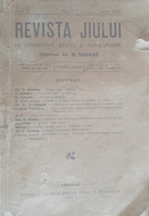 Vă oferim așadar din Revista Jiului de literatură, știință și popularizare (RJLSP) anul II Nr.1, iunie 1927, al cărui director, evident, e Dr. Nicolae Hasnaș, cele două eseuri semnate de dânsul: „Democrație; Cultură” la pag.1-8; „Semicentenarul Independenței”, la pag. 52-54.