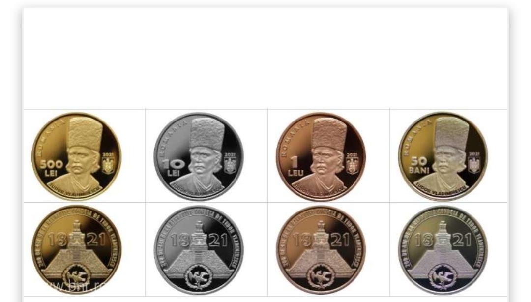 Banca Naţională a României lansează astăzi în circuitul numismatic monede din aur, argint, tombac cuprat şi alamă pentru colecţionare cu tema ”200 de ani de la Revoluţia din 1821 condusă de Tudor Vladimirescu”. Tirajul maxim aprobat pentru moneda din aur este de 1.000 de piese, pentru moneda din argint este de 5.000 de piese, pentru moneda din tombac cuprat este de 5.000 de piese, iar pentru moneda din alamă pentru colecţionare este de 20.000 de piese. Preţurile de vânzare sunt: 11.000 lei, exclusiv TVA, pentru moneda din aur, inclusiv broşura de prezentare; 440 lei, exclusiv TVA, pentru moneda din argint, inclusiv broşura de prezentare; 110 lei, exclusiv TVA, pentru moneda din tombac cuprat, inclusiv broşura de prezentare; 10 lei, exclusiv TVA, pentru moneda din alamă pentru colecţionare.