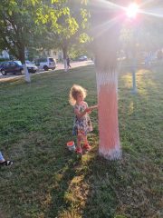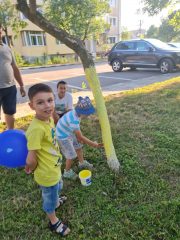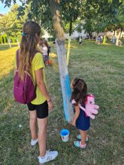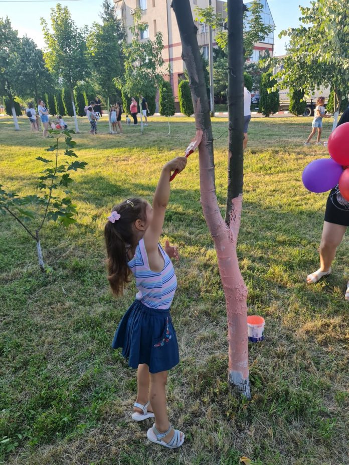 Copiii au fost cei care au vopsit, până la înălțimea lor sau în brațele părinților, tulpina arborilor respectivi.