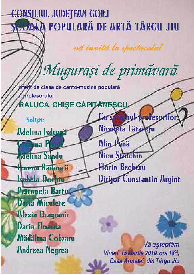 Şcoala Populară de Artă Târgu-Jiu organizează, vineri, de la ora 16.00, la Casa Armatei din municipiu un minispectacol ,,Mugurași de primăvară”, cu ocazia venirii primăverii. Pe scenă vor urca cursanţi ai clasei de canto- muzică populară, coordonaţi de Raluca Ghişe Căpitănescu, din cadrul ŞPA Târgu-Jiu.