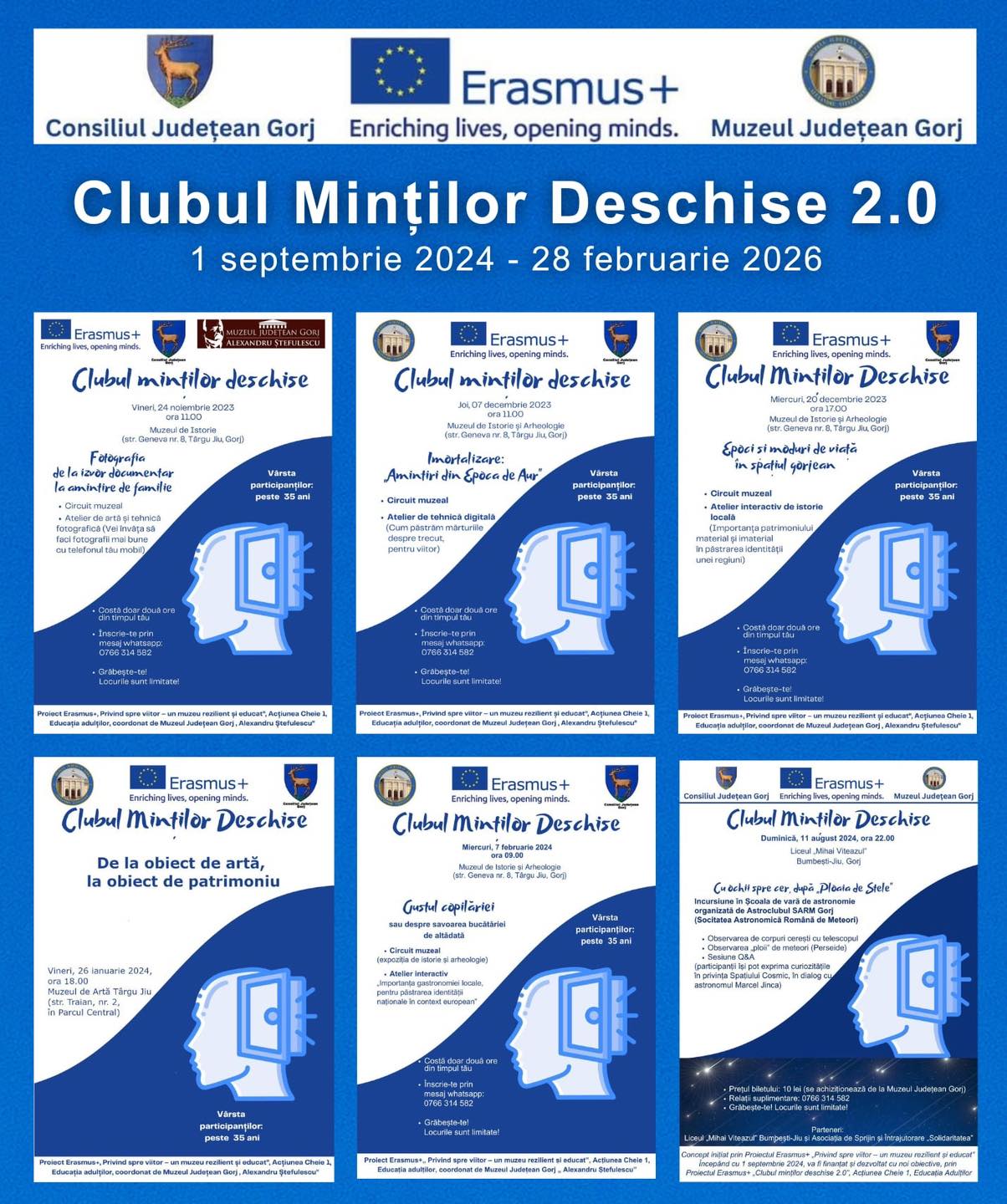 Astfel, proiectul “Clubul minților deschise 2.0”, ce se va derula în perioada 1 septembrie 2024 – 28 februarie 2026, va permite organizarea de noi sesiuni pentru adulții pasionați de istoria locală, fotografie, tradiții, artă, etc. Datorită acestui proiect vor fi abordate și teme noi în cadrul ”Clubului minților deschise” precum: sustenabilitate, digitalizare, sau incluziune socială. În cadrul proiectului finanțat prin programul Erasmus+, specialiști ai muzeului sau colaboratori vor participa la mobilități în diferite țări ale Uniunii Europene, pentru a se specializa și a iniția legături profesionale cu organizații muzeale din Europa, urmând să deprindă noi practici moderne de lucru în domeniul educației muzeale, în concordanță cu cerințele secolului XXI.