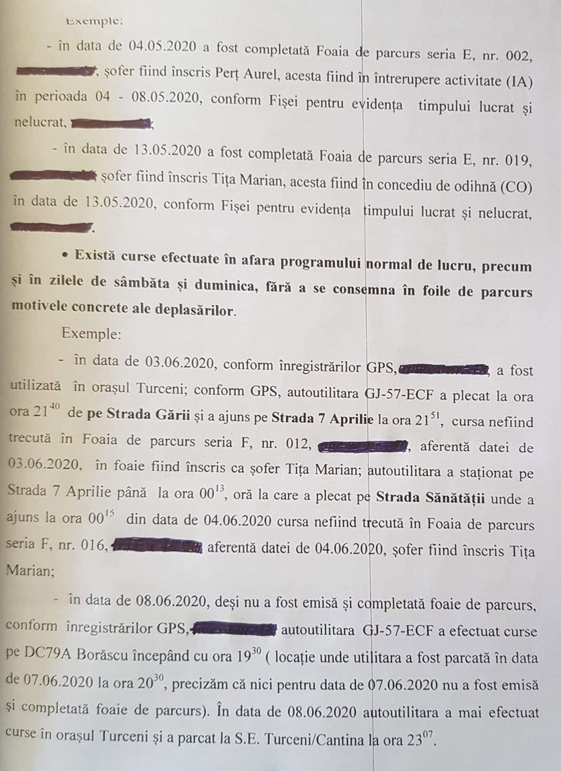 În urma sesizării făcute de un cetățean din orașul Turceni, luna trecută, omul reclamând că cu autoutilitara secției s-ar scoate materiale, combustibil și piese din termocentrală în scopul înstrăinării, Corpul de Control al managerului CEO s-a deplasat la secția ELCFU care deservește centrala. În timpul controlului, verificatorii depistează că șeful de secție, Aurel Perț, se afla conform pontajului în încetare de activitate, dar a emis foi de parcurs și a utilizat mașina unității, în scopuri personale.