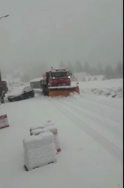Ninge abundent în stațiunea Rânca. Drumarii intervin cu utilajele de deszăpezire pe drumul spre staţiune.
