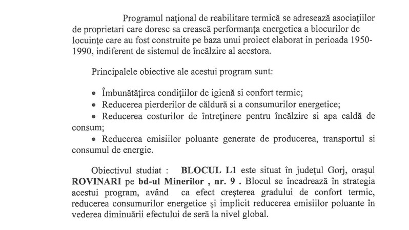 Potrivit caietului de sarcini, investiția prevede, între altele, termoizolarea pereților exteriori, termoizolarea și hidroizolarea teraselor sau a planșeului peste subsol, montare de tâmplărie PVC.