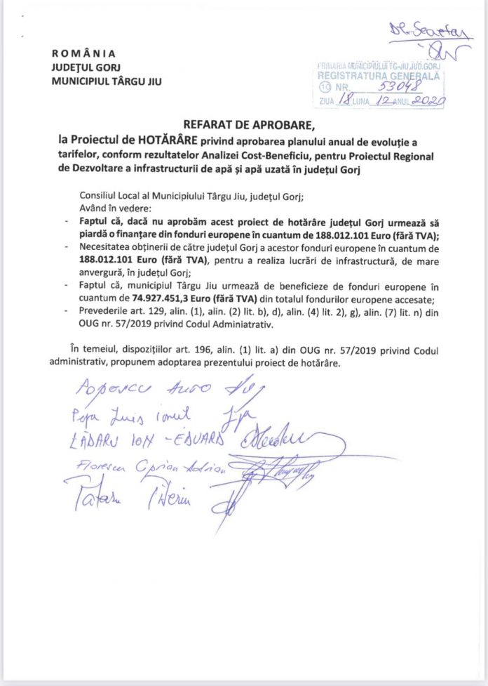 „În cadrul ședinței de Consiliu Local, de astăzi, consilierii locali ai Partidului Social Democrat au inițiat un proiect de hotărâre în urma căruia județul Gorj va putea beneficia de fonduri europene în valoare de 188.012.101 euro (fără TVA), dintre care 74.927.451, 03 (fără TVA) vor reveni municipiului Târgu Jiu. Aceste fonduri europene vor fi folosite pentru dezvoltarea infrastucturii de apă și apă uzată din județul Gorj, dar și din municipiul Târgu Jiu. În același timp, tot prin această hotărârea a fost aprobat planul anual de evoluție a tarifelor pentru perioada 2020 – 2026, conform rezultatelor Analizei Cost-Beneficiu pentru „Proiectul regional de dezvoltare a infrastructurii de apă și apă uzată din județul Gorj”, plan ce va intra în vigoare începând cu data semnării programului de finanțare. Această hotărâre inițiată de consilieri Partidului Social Democrat a fost votată de toți consilierii locali, indiferent de partidul din care fac parte, înțelegând astfel cu toții importanța acestui proiect pentru județul Gorj, dar în special pentru municipiul Târgu Jiu”, a anunțat Luis Popa, consilier PSD.