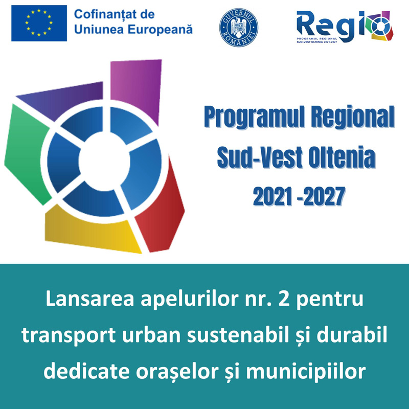 Finanțarea proiectelor în cadrul acestor apeluri de proiecte se va face doar după parcurgerea tuturor etapelor de selecție din primele apeluri dedicate oraselor si municipiilor, în cadrul regiunii Sud Vest Oltenia, și în limita sumelor ce rămân disponibile. Acţiunile principale sprijinite constau în: Dezvoltarea si optimizarea sistemelor de transport public; Sprijinirea infrastructurilor pentru moduri de transport active (nemotorizate); Activități conexe activității de bază. Categorii de solicitanți eligibili: Unitatea administrativ-teritorială (UAT) orașul, definită conform prevederilor OUG nr. 57/2019 privind Codul administrativ, cu modificările şi completările ulterioare și ale Legii nr. 2 din 16 februarie 1968 privind organizarea administrativă a teritoriului României (art. 4 (5)); Unitatea administrativ-teritorială (UAT) municipiul, definită conform prevederilor OUG nr. 57/2019 privind Codul administrativ, cu modificările şi completările ulterioare și ale Legii nr. 2 din 16 februarie 1968 privind organizarea administrativă a teritoriului României (art. 4 (5)); Parteneriatele prevăzute în Ghidurile solicitantului. Ambele apeluri sunt apeluri de proiecte competitive cu depunere la termen. Valoarea minimă eligibilă a unui proiect este de 250.000 euro, valoarea maximă eligibilă 5 milioane euro, iar ajutorul financiar nerambursabil este maximum 98% din valoarea cheltuielilor eligibile. Cererile de finanțare vor putea fi depuse exclusiv prin aplicația electronică MySMIS2021/SMIS2021+, începând cu data de 08 iulie 2024, ora 12:00. Data închiderii apelurilor este 08 noiembrie 2024, ora 12:00.