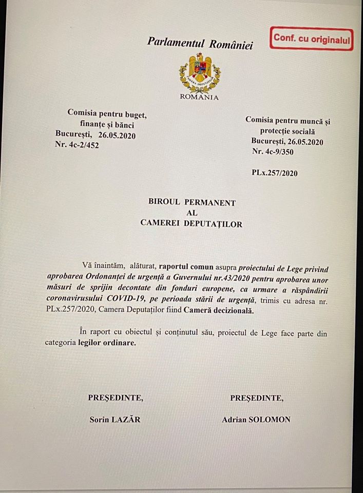 1. Aprobarea în plenul Camerei Deputaților, votul fiind programat pentru maine 27 mai 2020.