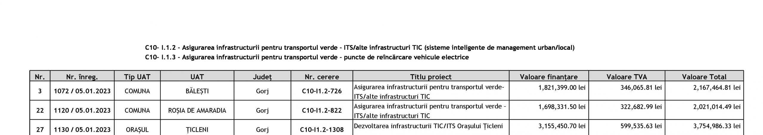 Din Gorj este vorba de comunele Bălești și Roșia de Amaradia și orașul Țicleni, care au primit finanțare pentru asigurarea și dezvoltarea infrastructurii pentru transportul verde. Cele două comune beneficiază de o finanțare de peste 2 milioane de lei, în vreme ce orașul Țicleni a primit 3,7 milioane lei.