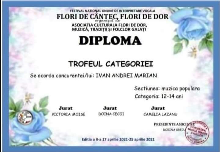 Două noi trofee în palmaresul Școlii Populare de Arte „Constantin Brâncuși” Târgu Jiu. Ambele au fost adjudecate de elevi ai instituției în urma participării la Festivalul Naţional online de Interpretare Vocală „Flori de cântec, flori de dor”. „Două trofee la Festivalul Naţional online de Interpretare Vocală „Flori de cântec, flori de dor”, ediția a II-a, Galați, 17-25 aprilie 2021!