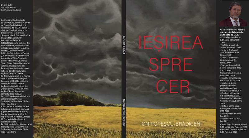 Fireşte că, din postura de teoretician al transmodernismului, din poziţia de metepoetician, Ion Popescu-Brădiceni îşi semnează el însuşi, doar e doctor în filologie şi scriitor profesionist (pe deasupra şi profesor universitar – n.m.,DAP.), şi prefaţa şi postfaţa cu acea erudiţie academică ce-i e proprie şi cu acea imbatabilă expresivitate ideatică şi cu acea retorică generală fundamentală (vezi contribuţia Grupului de la Liège[11] – n.m.,DAP.) în numele cărora poetul introduce figura în discurs şi de a transaparentiza semnul încât inseparabilitatea semnificantului şi a semnificatului e alchimicomagie pură (ca în poezia pură, adică – n.m.,DAP.). Aş putea redacta – dar fireşte cu alt prilej – un studiu de idiomatologie, care să-i releve distinct poetului Ion Popescu-Brădiceni mărcile care-i caracterizează individualitatea scriiturii limbajului auctorial specific – axat pe trei toposuri centrale: Graalul, Arca Metanoia şi Brădicenii; deocamdată să încerc a-i detecta demersurile proprii de construcţie a operei „Ieşirea spre cer”, pe speze identitare inconfundabile precum: * rotirea în jurul tricentrului; * poemul-grotă; * poemul: cuib-vulcanic-arhetipologic; * poemul: adăpost perfect ca şi limba română; * poemul-ghem al ideilor (meta)poe(i)etice; * reveria capodoperelor ori a „locurilor frumoase”; * contopirea ideilor în mitoficţiunile mirobolante; * sălăşluirea hierofaniei în forma perfectă; * dihotomia trialectică; po(i)eticitatea eclectică şi fantastică; contrazicerea doctrinei prin salagramă; * ars trans poetica: expresie a realităţii ultime; * „iresponsabilele asociaţii ideatice libere produse de imaginarul unui «vis literar»; * magia verbului şi căderea în extaz; * jocul secund; * „costumul” stilistic adecvat ca efect al vibraţiei neîntrerupte a instinctului de creaţie; * scrierea poemului direct pe aburii oglinzii cu o crenguţă de vâsc; * tragicul sentiment al timpului; * deschiderea unei căi spre esenţa ultimă a Lumii, adică spre nucleul ontic al realităţii, prin saltul cuantic; * promovarea ideii în literatură că doar elementele contradictorii creează un model propriu; * revelarea Realităţii Invizibile; * ţeserea unui discurs îndrăgostit grefat pe vechile arhetipuri, incantaţii şi mituri încă resurecte; refacerea relaţiei dintre sacru şi profan şi dintre poezie şi metafizică în realizarea spirituală ş.a.m.d.