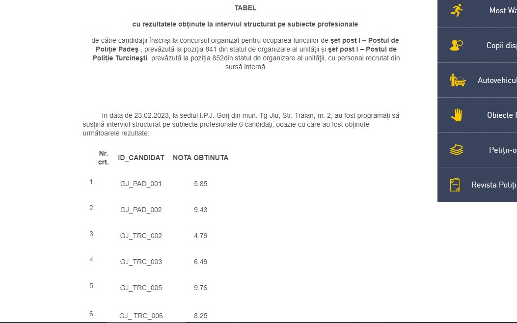 „Rezultatul la interviu se poate contesta o singură dată în termen de 24 de ore de la afişare. Nota acordată după soluţionarea contestaţiei la interviul structurat pe subiecte profesionale este definitivă. Candidaţii pot contesta numai notele la propriile lucrări”, potrivit IPJ Gorj.