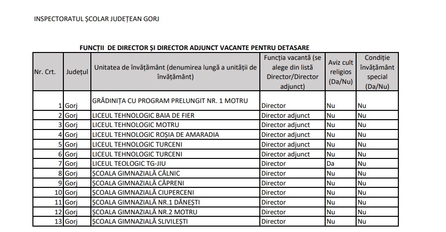 Posturile vacante de director plin sunt la Liceul Teologic Târgu-Jiu, Grădinița cu Program Prelungit nr. 1 Motru și la școlile gimnaziale din Câlnic, Căpreni, Ciuperceni, Dănești (nr. 1), Motru (nr. 2) și Slivileștii, iar cele de director adjunct sunt la liceele tehnologice din Baia de Fier, Motru, Roșia de Amaradia și Turceni (2 posturi).