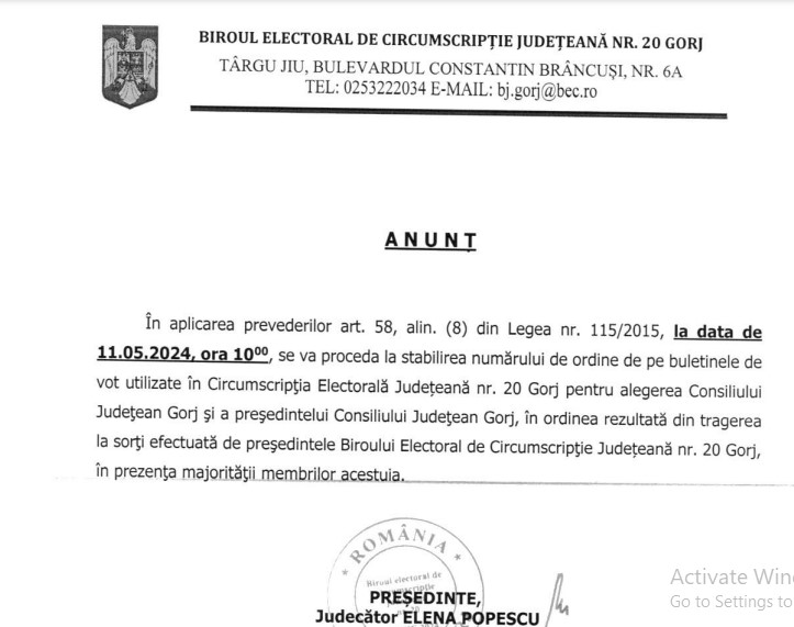 BEC Gorj a anunțat că pe data de 11 mai se va stabili ordinea pe buletinele de vot: „În aplicarea prevederilor art. 58, alin. (8) din Legea nr. 115/2015, la data de 11.05.2024, ora l0.00, se va proceda la stabilirea numărului de ordine de pe buletinele de vot utilizate în Circumscripția Electorală Județeană nr. 20 Gorj pentru alegerea Consiliului Județean Gorj și a președintelui Consiliului Județean Gorj, în ordinea rezultată din tragerea la sorți efectuată de președintele Biroului Electoral de Circumscripție Județeană nr. 20 Gorj, în prezența majorității membrilor acestuia”.