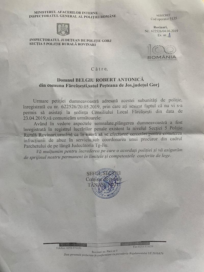 Plângerea penală s-a depus la Poliția Rovinari, imediat după această ședință, de către Robert Belgiu membru ALDE. Acesta i-a acuzat și în scris pe cei nouă aleși că abuzează de funcția lor pentru a vota bugetul localității cu ușile închise.