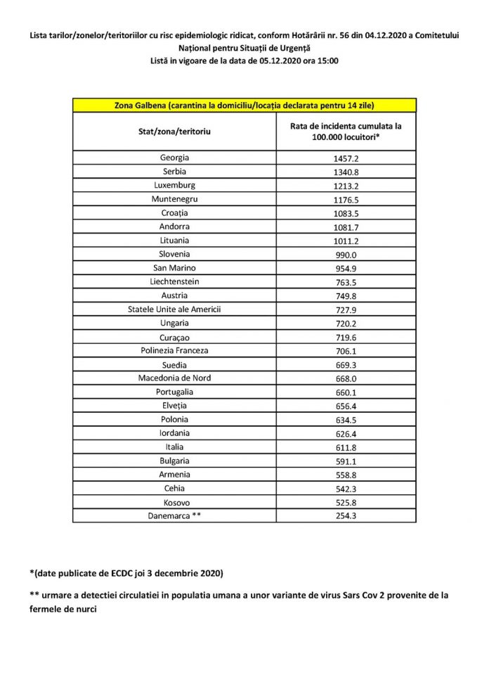 Lista tarilor/zonelor/teritoriilor cu risc epidemiologic ridicat, conform Hotărârii nr. 56 din 04.12.2020 a Comitetului Național pentru Situații de Urgență.